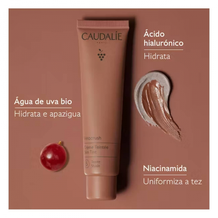 Caudalie - Vinocrush é um creme com cor que corrige e uniformiza o tom da pele, realçando a sua beleza natural. Os seus pigmentos encapsulados de origem natural fundem-se na pele na aplicação, revelando uma tonalidade que vai ao encontro do seu tom de pele para uma tez zero defeitos e um acabamento ultranatural. Algo entre o cuidado da pele e a maquilhagem, a sua fórmula clean e natural com ácido hialurónico e água de uva deixa a pele hidratada e tez luminosa ao longo do dia.