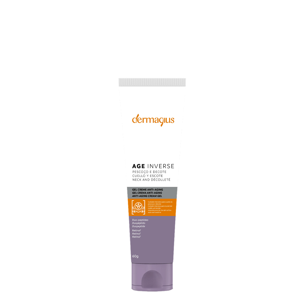 Dermagius - Age Inverse Gel-creme Anti Idade Pescoço e Decote contém na sua composição: Duo Peptídeos e o Retinol que estimulam a produção de colagénio e elastina e Ácido Hialurónico que aumenta a hidratação e promove a regeneração da pele.