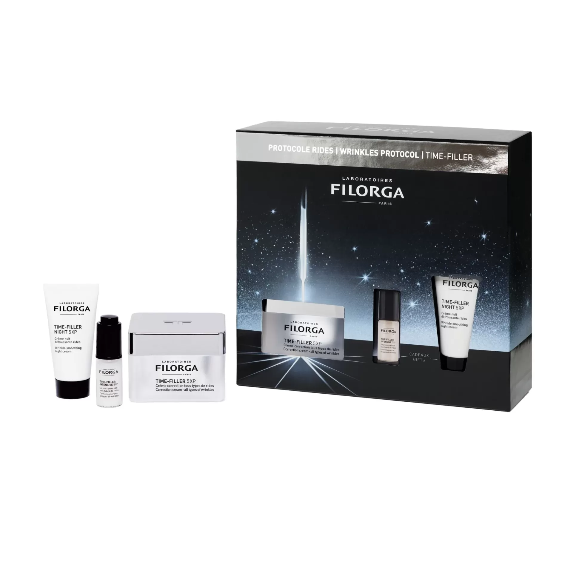 Filorga - Coffret Time-Filler Protocolo Anti-Rugas é um kit que contém: 1 Filorga Time-Filler 5XP Creme 50 mL + 1 Filorga Time-Filler Intensive 5XP 5 mL + 1 Filorga Time-Filler Night 5XP 14 mL.