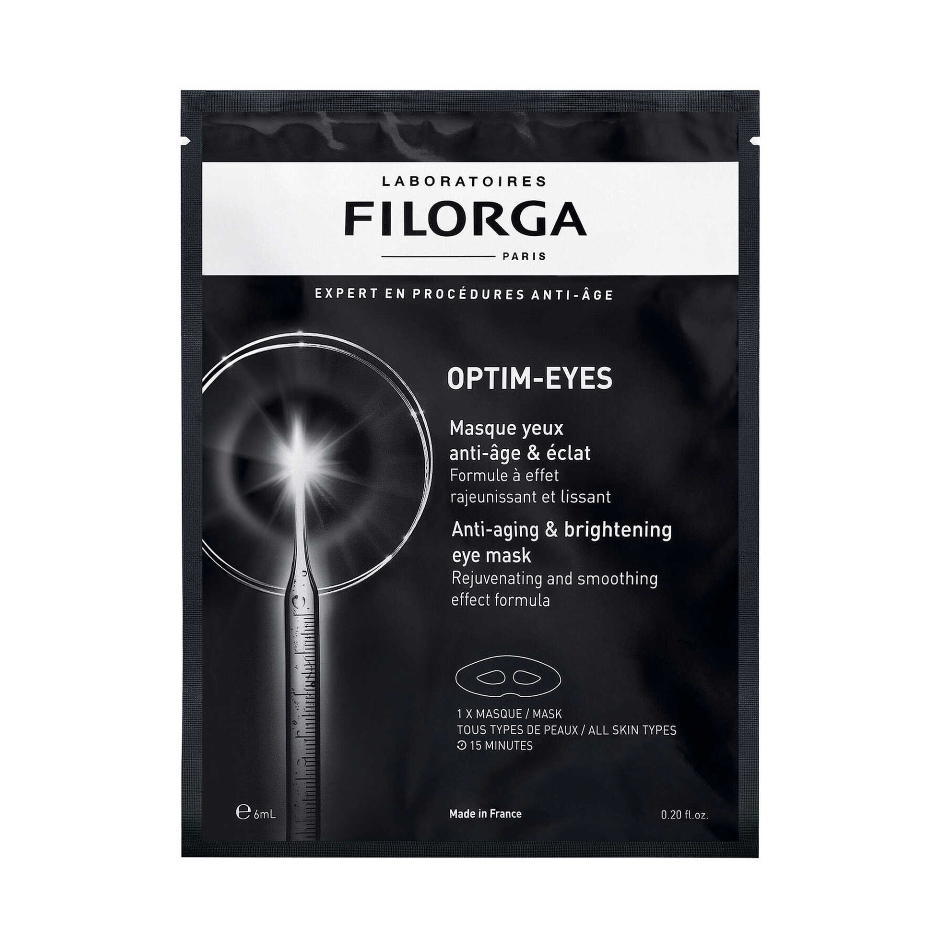 Filorga - Optim-Eyes Máscara Contorno Olhos é uma máscara de tecido de tripla ação para o contorno dos olhos com uma fórmula antienvelhecimento e iluminadora, perfeita para quem procura resultados rápidos e eficazes, especialmente em momentos em que o olhar parece cansado, baço ou marcado. Em apenas 15 minutos, combate visivelmente os sinais de fadiga: papos, olheiras e rídulas.