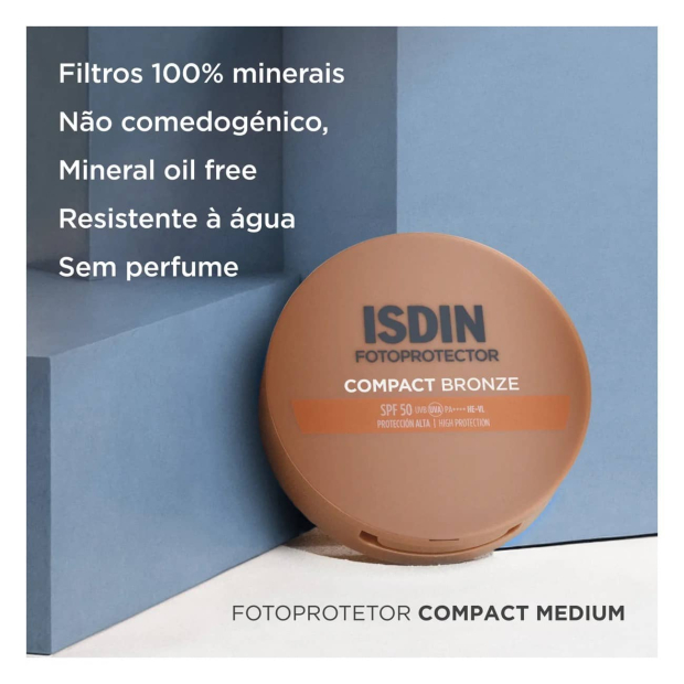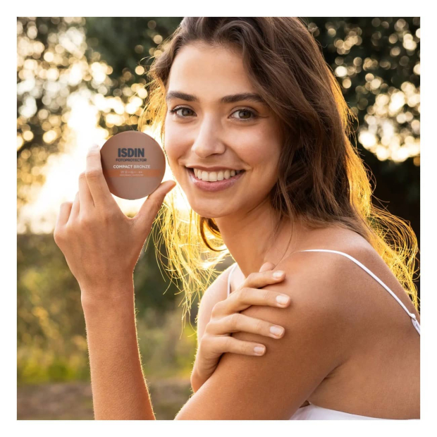 Isdin - Fotoprotector Compact Bronze SPF50 tem uma textura cremosa, fácil de aplicar, que contém filtros solares de amplo espectro que protegem a pele dos raios solares.