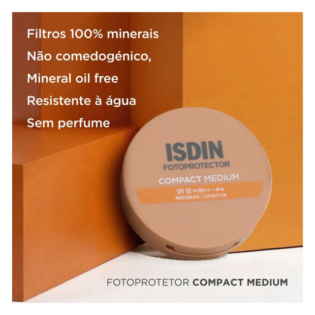 Isdin - Fotoprotector Compact Medium SPF50 tem uma textura cremosa, fácil de aplicar, que contém filtros solares de amplo espectro que protegem a pele dos raios solares.