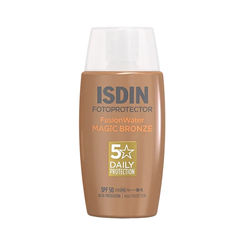 Isdin - Fotoprotector Fusion Water Color Bronze SPF50 é um protetor solar ultraligeiro e de uso diário que além de garantir uma elevada proteção contra a radiação UVB e UVA proporciona uma cobertura natural que disfarça imperfeições, uniformiza o tom de pele e proporciona um efeito aspeto saudável. Elevada proteção SPF 50 avaliada clinicamente em laboratório e em condições reais de elevada radiação solar. Hidrata em profundidade graças à sua fórmula com ácido hialurónico. A sua textura ultraligeira de acabamento sedoso é absorvida de imediato sem deixar resíduo oleoso.