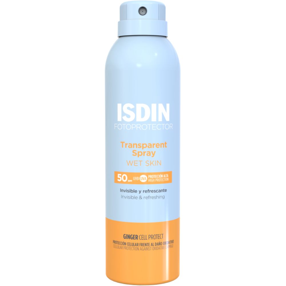 Isdin - Fotoprotector Transparent Spray Wet Skin SPF50 tem uma proteção solar SPF50+ para pele normal, mista e oleosa, especificamente desenvolvido para aplicação tanto na pele molhada como seca.
