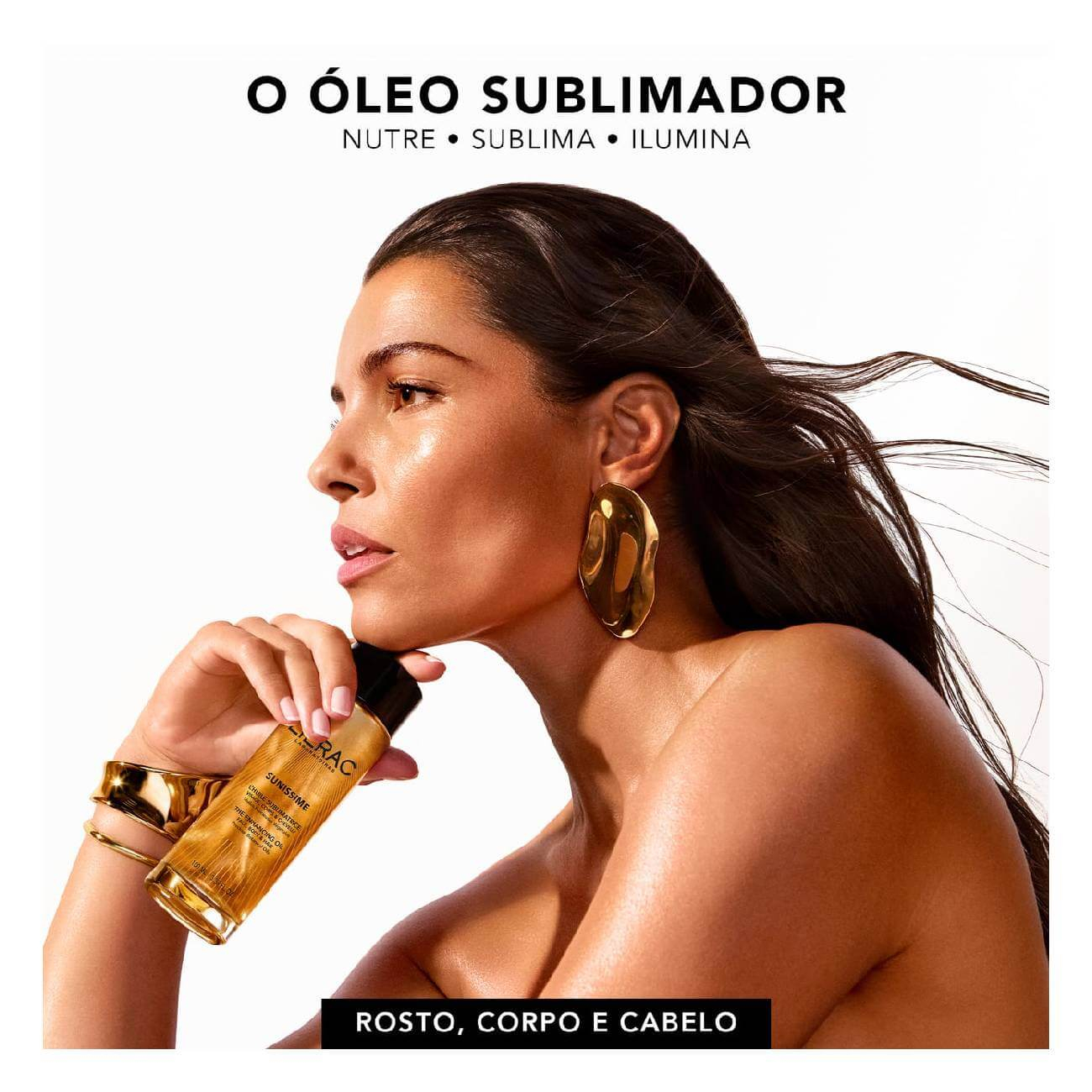 Lierac - Sunissime O Óleo Sublimador é um cuidado sublimador formulado com 4 óleos botânicos preciosos que nutre e realça a luminosidade natural num só gesto. A sua textura ligeira deixa a pele e os cabelos com um acabamento acetinado de reflexos dourados, sem deixar sensação de oleosidade. Indicado para o rosto, corpo e cabelo.