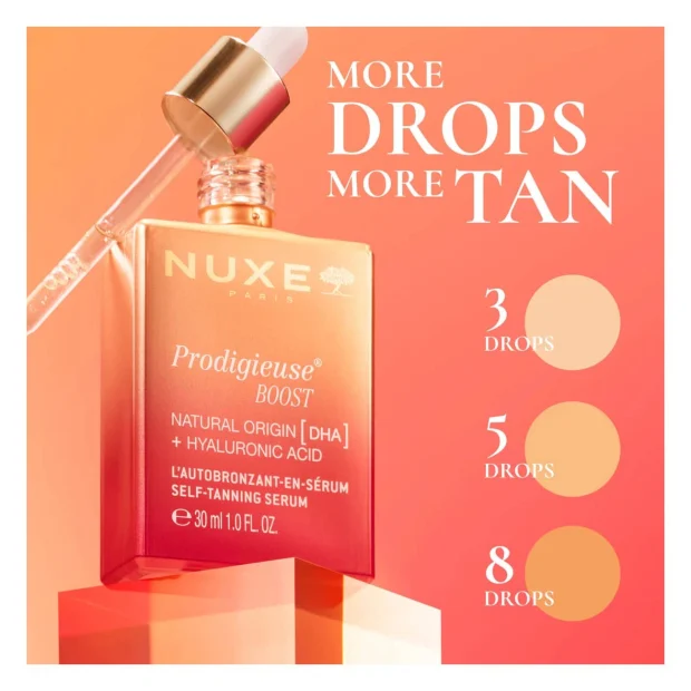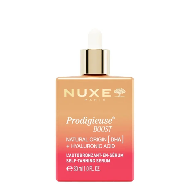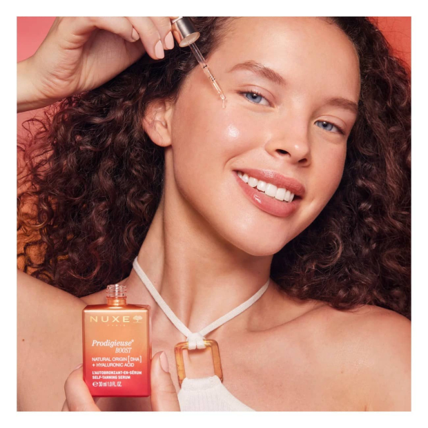 Nuxe Prodigieuse Boost Sérum Autobronzeador tem uma textura leve e de rápida absorção e uma fórmula com 97% de ingredientes naturais. Com ácido hialurónico de dois pesos moleculares, que hidrata profundamente e preenche a pele. DHA 100% natural, que proporciona um bronzeado uniforme e natural.