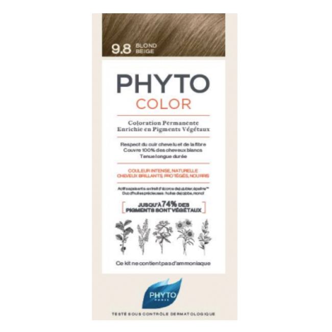 Phytocolor Coloração capilar permanente 9.8 Louro Beige com pigmentos vegetais, e sem amoníaco, PPD ou resorcina que proporciona uma cobertura de 100% dos cabelos brancos, garantindo uma cor brilhante e duradoura. Ideal para couro cabeludo sensível.